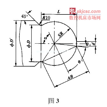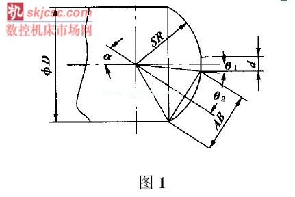 在實際生產(chǎn)中經(jīng)常碰到車削圓球面, 除了單件生產(chǎn)采用雙手控制法加工外, 大都采用旋風(fēng)切削法加工。用旋風(fēng)切削圓球面時, 需要根據(jù)工件球面的形狀計算出刀具盤旋轉(zhuǎn)軸線應(yīng)與工件旋轉(zhuǎn)軸線的夾角α、以及刀具盤上兩刀尖間的距離AB 。