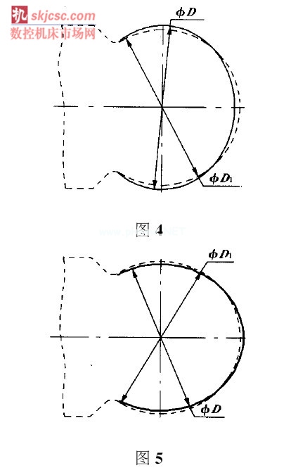 當(dāng)試切的球面如圖4 所示, 其中D 為實測尺寸, D1為正確尺寸。D > D1時, 說明刀盤旋轉(zhuǎn)軸線與工件旋轉(zhuǎn)軸線的交點(diǎn)在球面中心的左側(cè), 此時應(yīng)將交點(diǎn)往右移, 即調(diào)整工件和刀盤的相對位置, 再試切直至橢圓度消失為止。當(dāng)試切的球面如圖5 所示,D < D1 時, 說明刀盤旋轉(zhuǎn)軸線與工件旋轉(zhuǎn)軸線的交點(diǎn)在球面中心的右側(cè), 此時應(yīng)將交點(diǎn)往左移, 即調(diào)整工件和刀盤的相對位置, 再試切直至橢圓度消失為止。對于圖1 球冠和圖2 半球面可用圓弧樣板檢驗球面質(zhì)量。此外在加工上述各類型球面時, 要特別注意工件與刀盤的相對位置, 從而保證一批工件在加工中始終處于正確位置。