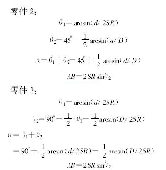 如圖1 、圖2 、圖3 中所示各類型桿類球面零件有一顯著特點(diǎn), 即球面頭部有一中心孔, 做為各工序基準(zhǔn), 為保證后序工序加工, 在加工球面時, 應(yīng)予保留, 這樣就等于在該處有一小球缺, 此時, 若加工如圖1 、圖2 、圖3 所示各類型零件的球面時, 其刀具盤旋轉(zhuǎn)軸線與工件旋轉(zhuǎn)軸線的夾角α和刀具盤上兩刀尖間的距離AB 的計算公式分別為