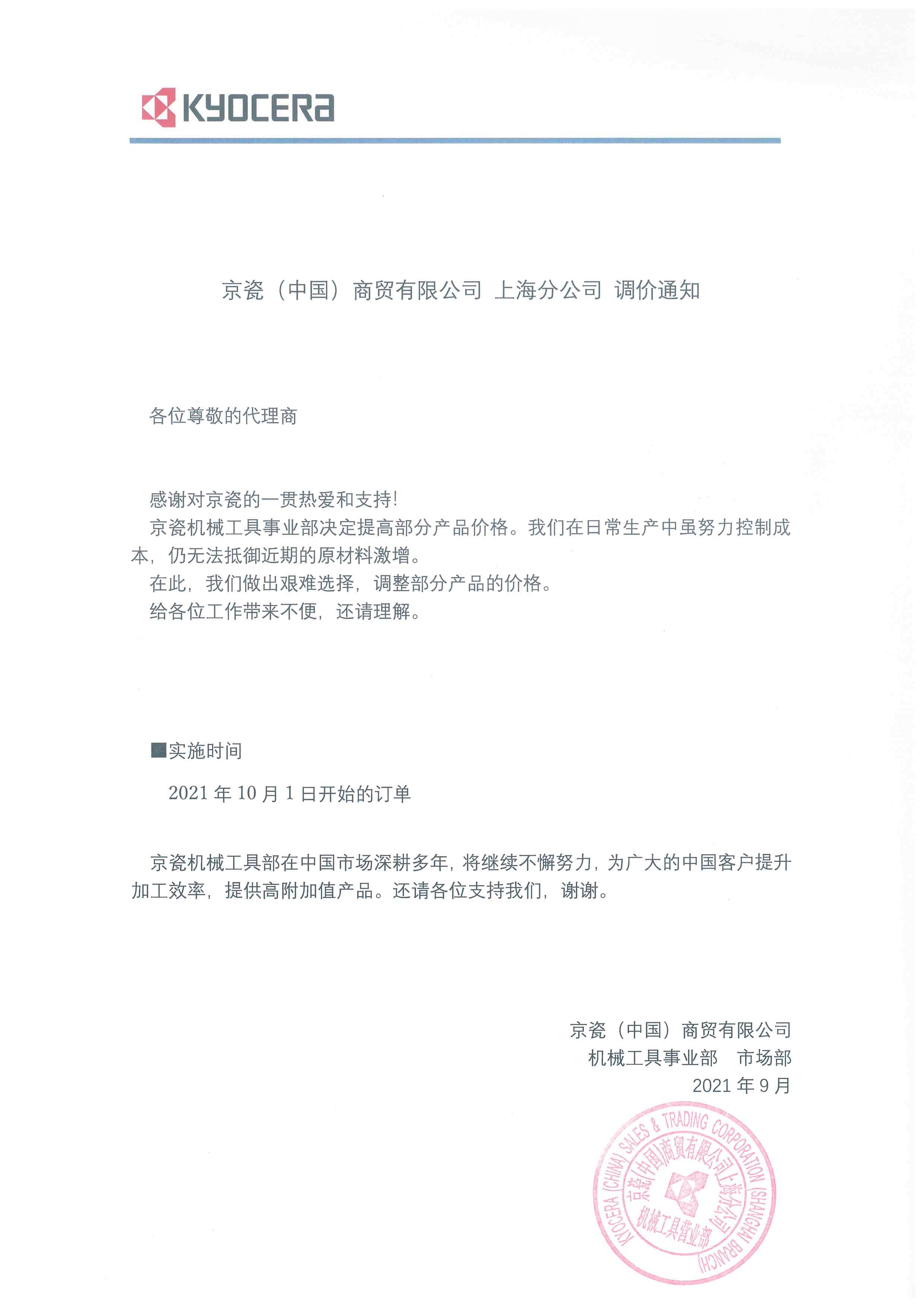 京瓷漲價函(京瓷于2021年10月1日實行新價格)