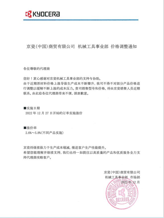 2022年京瓷漲價函(京瓷于2022年12月27日實行新價格)